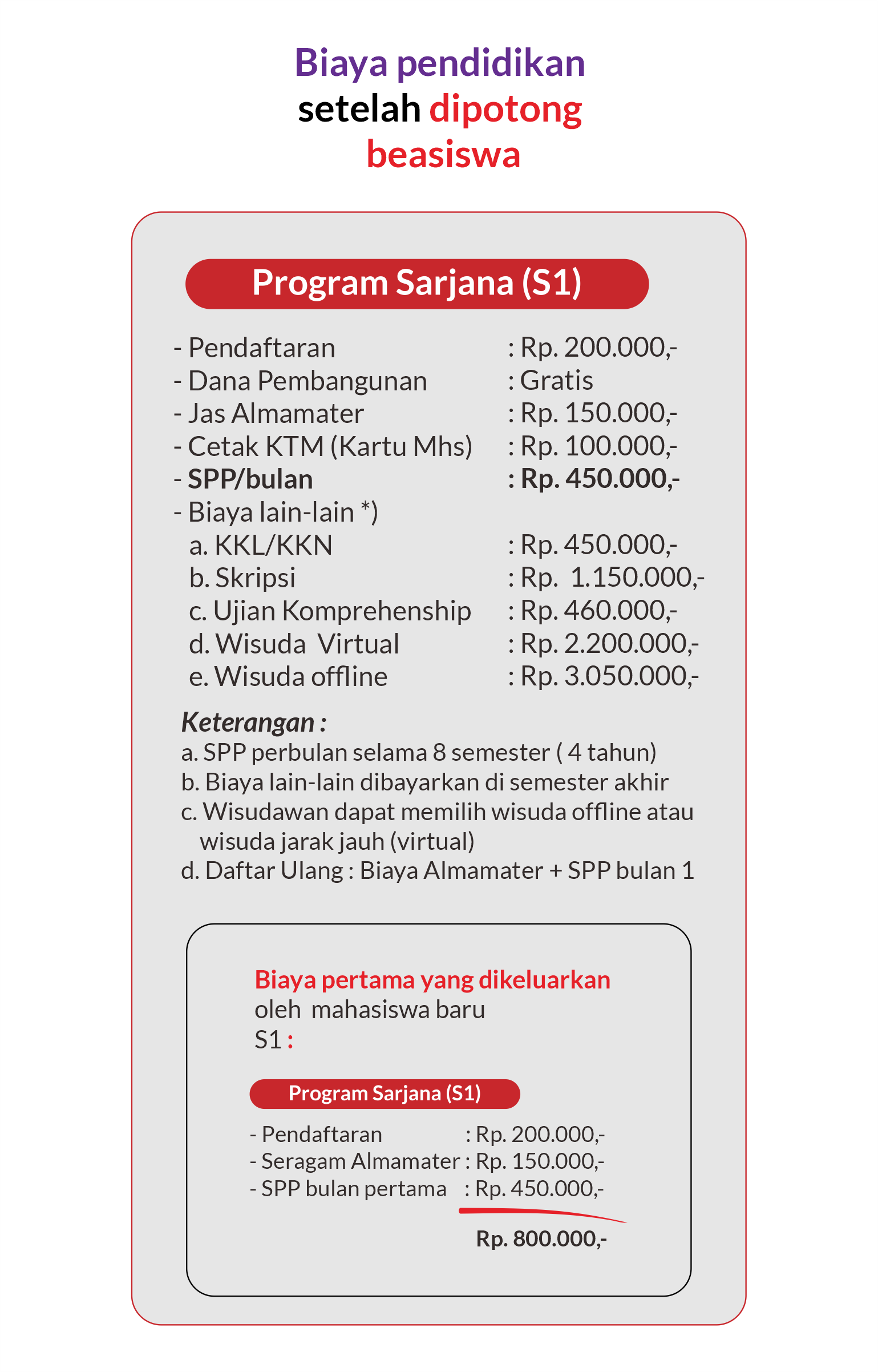 Beasiswa sebesar 65 % dengan besaran SPP tinggal Rp. 450.000 per bulan
